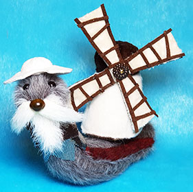 Auch Don-Quijote-Schnecken rennen gern gegen Windmühlen an. Als"Schnecke der traurigen Gestalt" gibt Alonso aber ein recht stattliches Bild ab, er ist 10,5cm lang und ca. 10cm hoch. Mit glänzender Rüstung, wasch-schüsselartigem Helm, staattlichem Bart und natürlich der Windmühle, kommt bei dieser Bastelpackung bestimmt keine Langeweile auf. Erfahrungen im Mininähen sind aber empfehlenswert. |