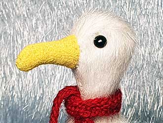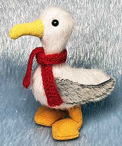 Gulliver bringt mit seinen 6,5cm ein wenig Strandgefühl in ihr Zuhause. Er ist eine typische Möwe,frech,guckt intelligent und trotzt Wind und Wetter mit seinem stylischen handgestrickten Schal. Erfahrungen im Mininähen sollten daher auf jeden Fall vorhanden sein. Gulliver bringt 2 Fußvariationen mit,für den Fall das die "stehenden" Füße doch zu schwierig sein sollten! Die Anleitung umfasst daher 16 Seiten und ist wie immer gut bebildert. In der Bastelpackung ist der Schnitt,die ausführliche Anleitung,der Stoff, Ösenstifte für die Füße,die 3mm Glasaugen enthalten und natürlich der von mir handgestrickte Schal aus feiner roter Schurwolle. Zusätzlich benötigten sie nur das übliche Werkzeug wie z.B.: Pinzette,Seitenschneider,Rundzange,Füllmaterial,Nadeln,reißfesten Faden, feines Stahlgranulat,Stecknadeln und etwas Gewebeklebeband aber das ist in der Anleitung ganz genau erklärt. |